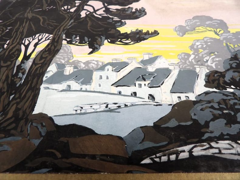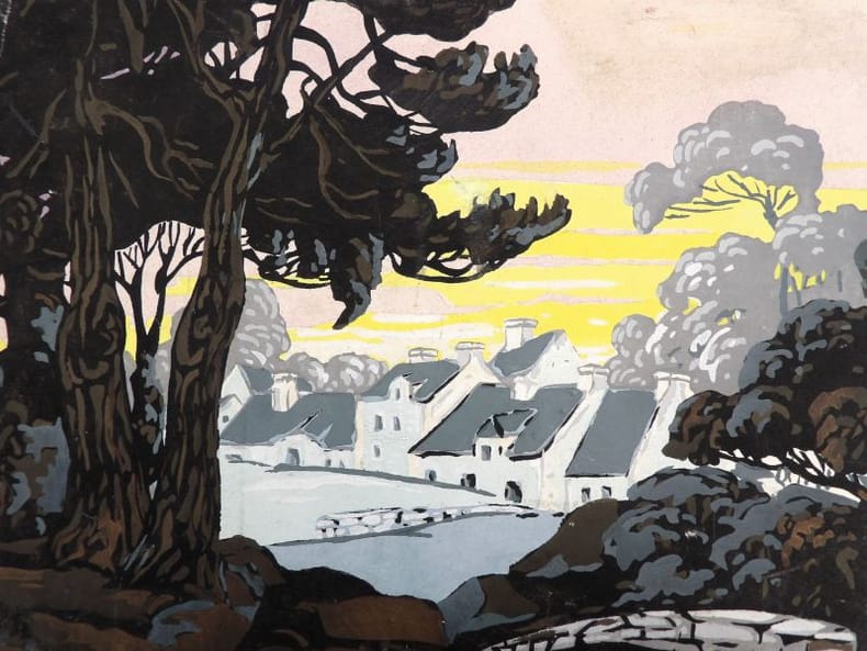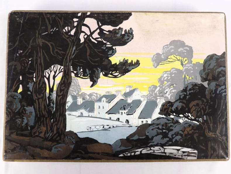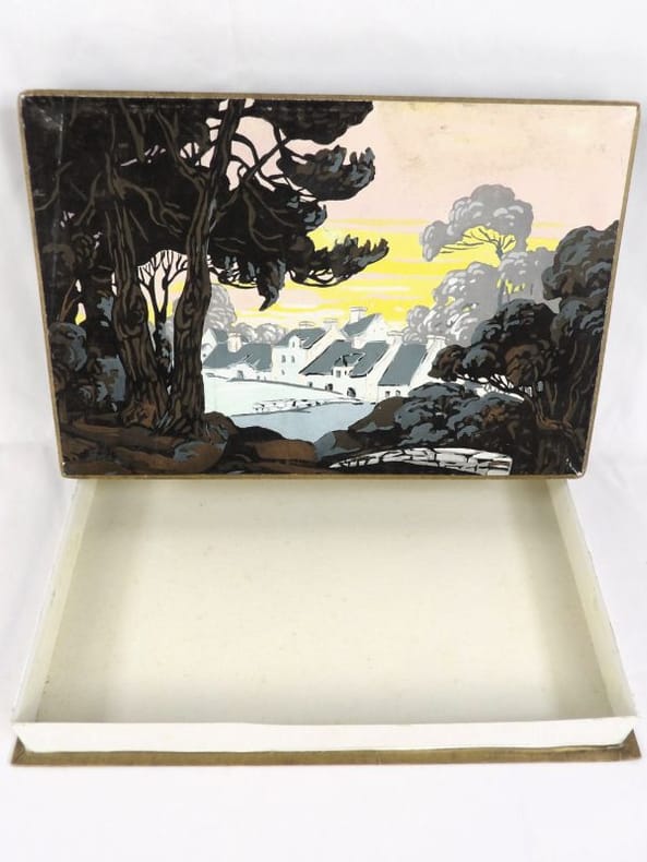 Sans lieu, AGB, sans date (années 1920). Dimensions : 24x31,5cm (plié), 48x31,5cm (déplié). Feuille seule. Les pages de garde de la revue Art Goût Beauté étaient ornées de motifs de tissus fabriqués par Albert Godde, Bedin & Cie. Au dos de celle-ci se trouvaient également des publicités pour des maisons de Haute Couture et des fabricants d'accessoires de luxe. La revue Art Goût Beauté a été lancée à l'automne 1920 sous le titre Les Succès d'Art Goût Bon Ton puis adopta en novembre 1921 le nom d'Art Goût Beauté qui reprenait les initiales de l'éditeur, la maison de tissus "Successeurs d'Albert Godde Bedin". Cette revue doit sa renommée aux nombreuses illustrations in-texte coloriées au pochoir qui présentent les modèles des grandes maisons de couture parmi lesquelles : Bernard, les sœurs Callot, Doeuillet, Doucet, Drecoll, Jenny, Martial et Armand, Philippe et Gaston, Poiret, Premet, Worth, etc. Dans les années 1930, la revue change finalement de format avant de s'éteindre en 1933. Chaque planche est devenue un objet de collection et il est aujourd'hui quasiment impossible d'en trouver une série complète, même dans les bibliothèques spécialisées.